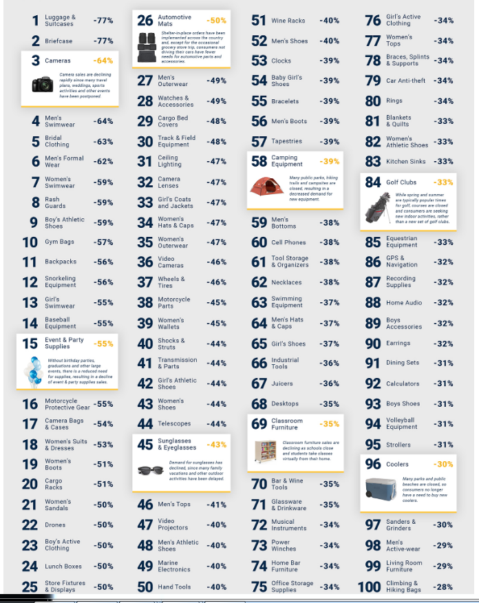 与此同时,知名调研机构Stackline统计了今年3月疫情期间美国电商销量降幅最快的TOP100品类榜单。榜单显示,消费者的购物行为发生了明显变化。其中,行李箱、公文包、相机、男士泳衣、新娘服装、男士正装、女士泳衣、防晒衣、运动鞋(男)、运动包等降幅明显。