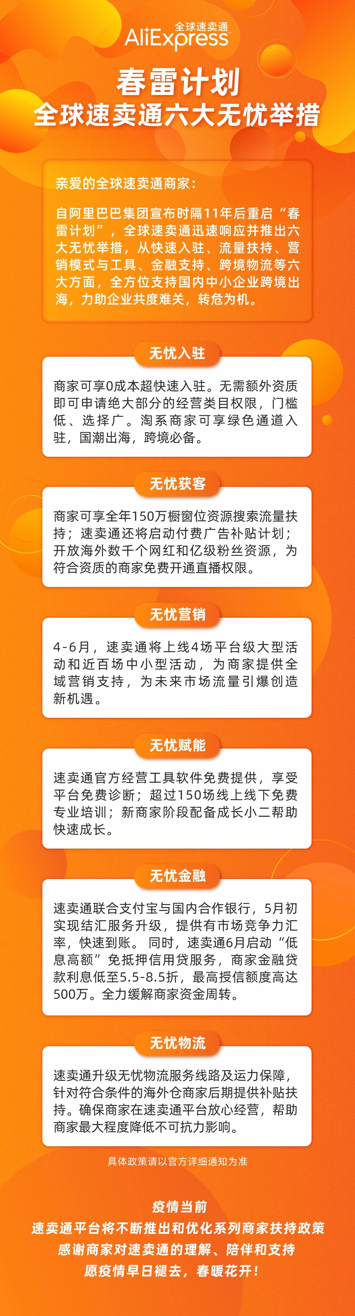 【亿邦原创】4月17日消息,为响应阿里巴巴“春雷计划”。全球速卖通今日从从快速入驻、流量扶持、营销模式与工具、金融支持、跨境物流等六大方面推出“无忧举措”,扶持国内中小企业跨境出海。