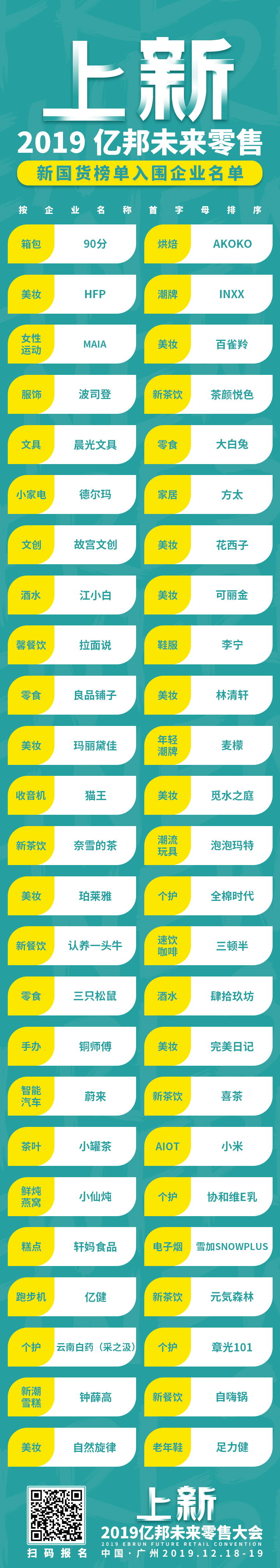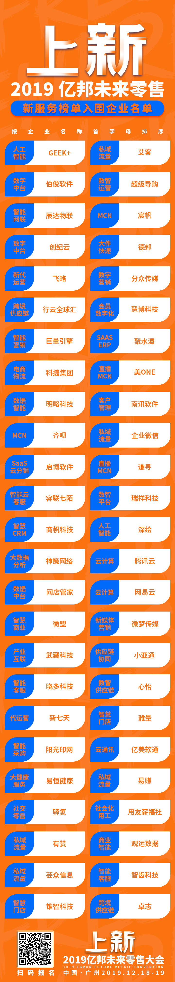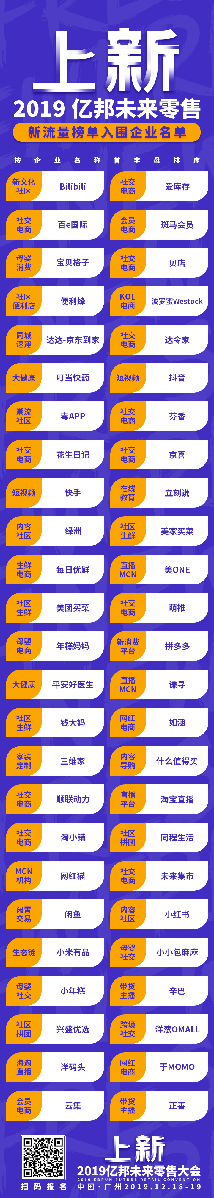 2019亿邦未来零售榜单作为零售大会的重磅环节,由亿邦未来零售评审团依据企业申报信息,从创新性、影响力、高成长性等纬度,进行独立评选。率先公布新流量、新国货、新出海、新服务榜单,各入围的50家企业。
