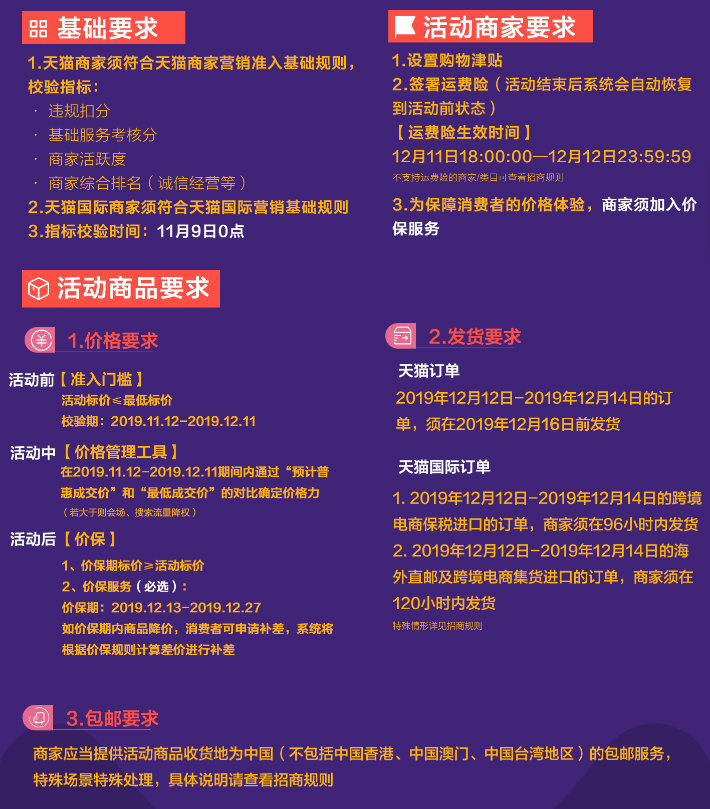 在发货要求上,天猫要求12月12日0点至14日24点期间消费者付款的天猫平台订单(虚拟类目除外),商家须在12月16日24点前真实发货。