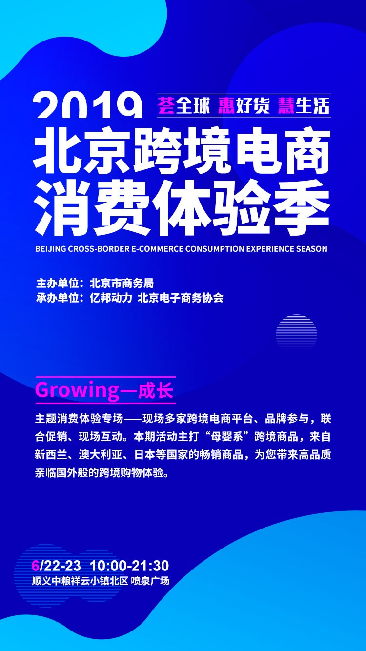 “2019北京跨境电商消费体验季”于5月30日正式启动。体验季活动自2016年以来已连续举办四届,影响力逐年提升,成为京城消费者最为关注的消费体验活动之一。本届体验季活动将于2019年6月-8月举办,持续三个月,重点围绕跨境消费体验、合作资源对接、相关政策推介三方面内容展开。通过线上与线下结合,通过线上联合促销、线下消费体验、政策研讨会、资源对接会、社区活动等多种形式,全方位展现北京跨境电商发展特点,提升北京跨境电商产业发展水平,营造跨境消费新热潮,助力北京打造国际消费枢纽城市。
