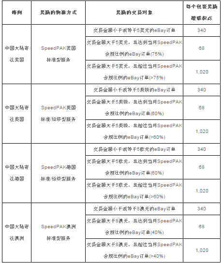 公告显示,eBay将于北京时间2019年2月1日起至2019年2月28日,实施新的SpeedPAK从中国大陆发往美、英、德、澳路向运费奖励活动(以下简称活动)。活动细则如下: