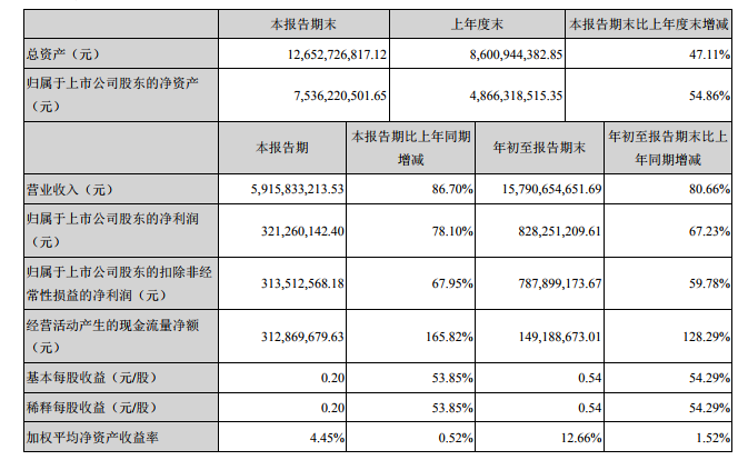其中,第三季度当季营收59.16亿元,同比增长86.70%;归属上市公司股东净利润3.21亿元,同比增长78.10%。