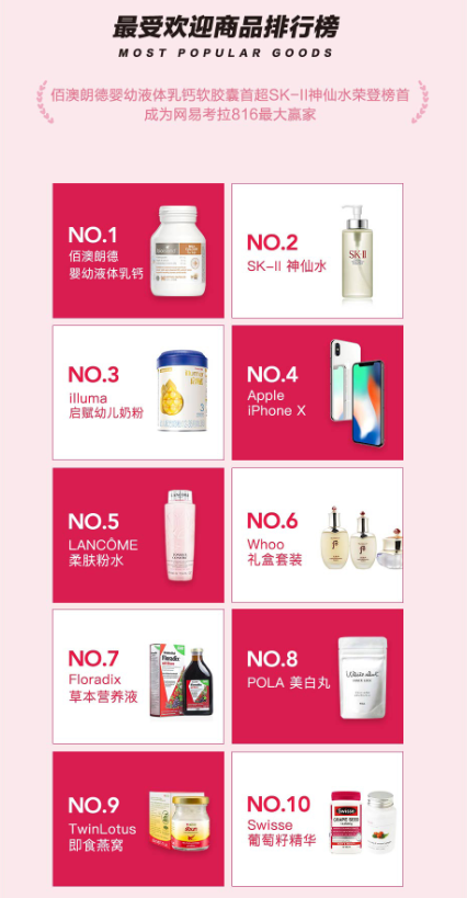 【亿邦动力讯】8月21日消息,今日网易考拉公布“816放心购物节”72小时数据盘点。数据显示,佰澳朗德婴幼液体乳钙软胶囊成网易考拉816最大赢家,首次击败SK-II神仙水,荣登最受欢迎商品排行榜榜首。
