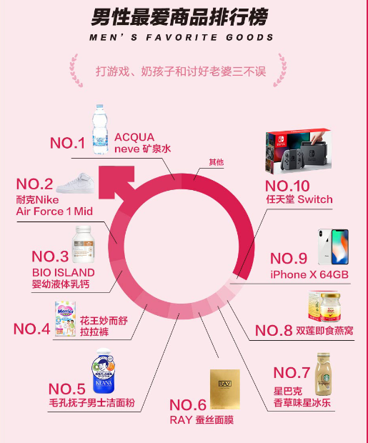 数据还显示,在“816放心购物节”中,男性用户贡献的消费主要集中在婴幼儿用品、礼物类女性用品和数码产品上。