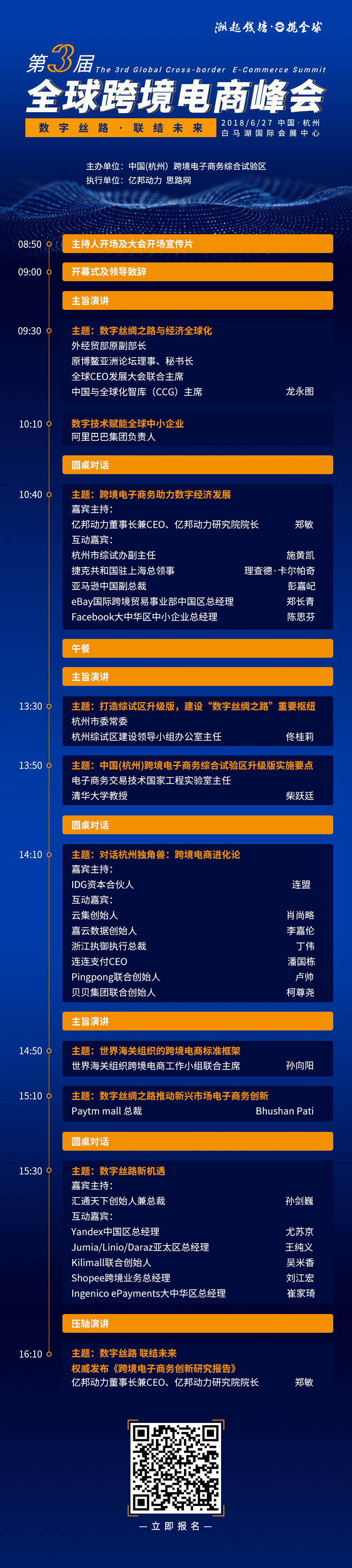 据悉,原外经贸部副部长、原博鳌亚洲论坛秘书长龙永图,电子商务交易技术国家工程实验室主任、清华大学教授柴跃,世界海关组织跨境电商工作小组联合主席孙向阳,亿邦动力董事长郑敏、捷克驻上海总领事理查德?卡尔帕奇,亚马逊中国副总裁彭嘉屺,eBay国际跨境贸易事业部中国区总经理郑长青,Facebook大中华区中小企业总经理陈思芬,IDG资本合伙人连盟,云集创始人肖尚略,杭州嘉云创始人李嘉伦,浙江执御执行总裁丁伟,连连支付CEO潘国栋,Pingpong联合创始人卢帅,贝贝集团联合创始人柯尊尧,汇通天下CEO孙剑巍,Shopee跨境业务总经理刘江宏,Yandex中国区总经理尤苏京,Rocket旗下三大电商平台(Linio/Jumla/Daraz)亚太区总经理王纯义,Kilimall联合创始人吴米香,Ingenico ePayments大中华区总经理崔家琦等将作为分享和互动嘉宾参与此次峰会。