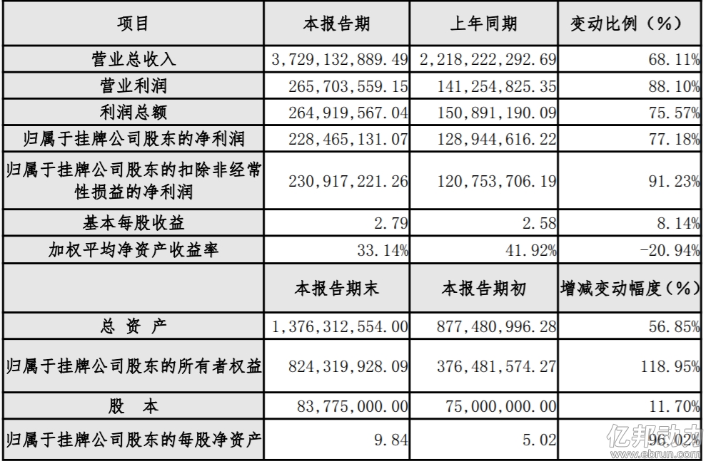 傲基电商业绩快报显示,2017年,司营业总收入3,729,132,889.49元(超过37.2亿元),同比增长68.11%;实现营业利润265,703,559.15元(超过2.6亿元),同比增长88.10%;实现利 润总额264,919,567.04元(超过2.6亿元),同比增长75.57%;实现归属于挂牌公司股 东的净利润228,465,131.07元(超过2.2亿元),同比增长77.18%。