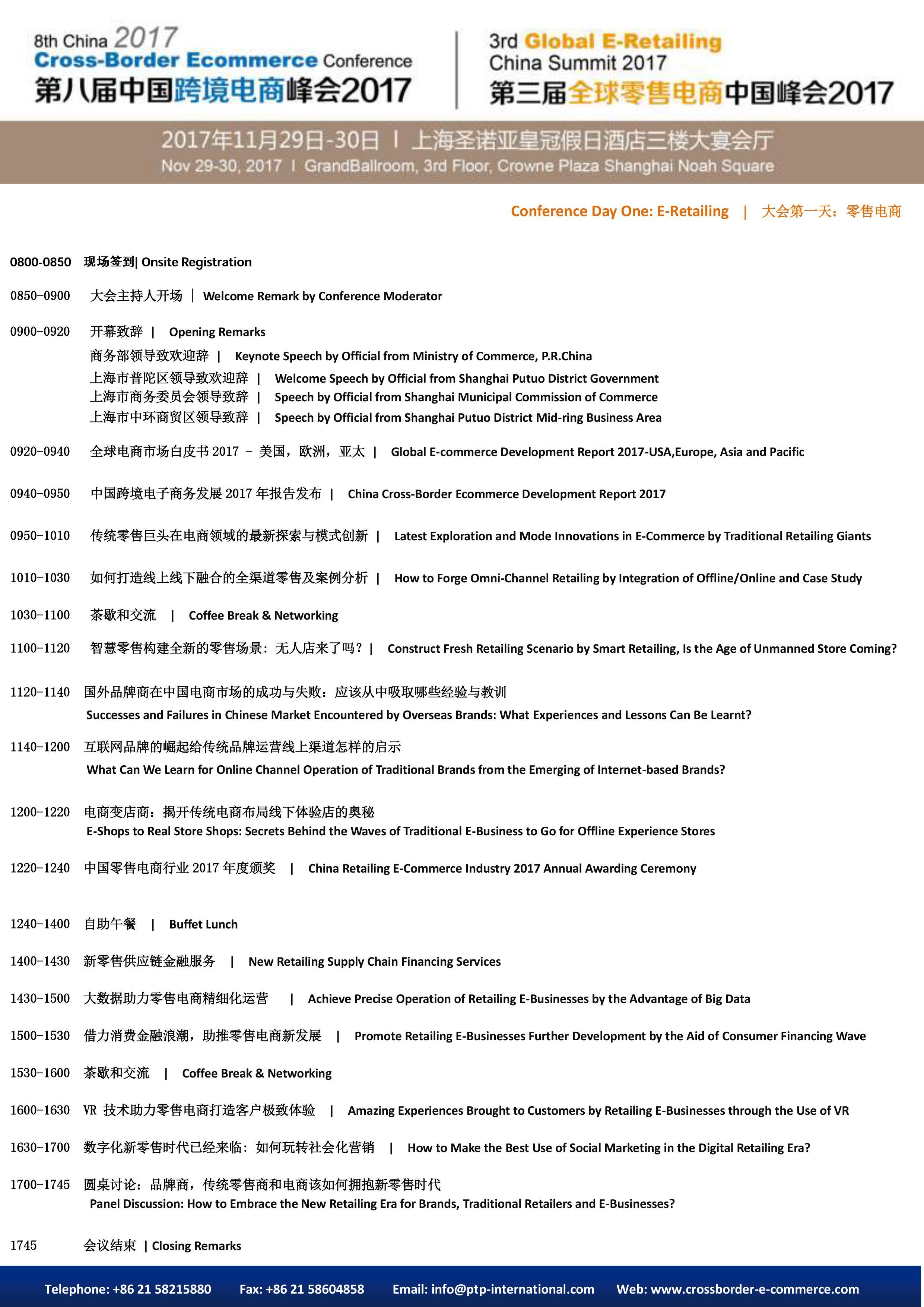 在这样的背景下,由由领思国际(PTP International)主办的“2017第三届全球零售电商峰会暨展览”将于11月29日在上海举行。本次活动得到了中国有关政府部门的大力支持,包括商务部电子商务司,上海市商委,上海市普陀区政府相关领导将出席本次峰会并做致辞。本次峰会将汇聚来自零售与电商领域的来自20个国家的500多名代表,覆盖全产业链,零售业从业者将共聚一堂,探讨交流商业元素如何重构、线上线下如何低成本融合、线下实体店铺如何改造升级、如何提升聚客及运营能力,如何引入科技元素实现数据价值的捕捉与使用以及线上线下融合下的新经营实体分析。本次会议将为您提供一个绝佳的沟通和联络平台,您可以通过此次活动,了解中国零售市场最新进展,树立企业品牌,开拓潜在客户,寻求业务合作,在中国零售市场的竞争中占得先机。