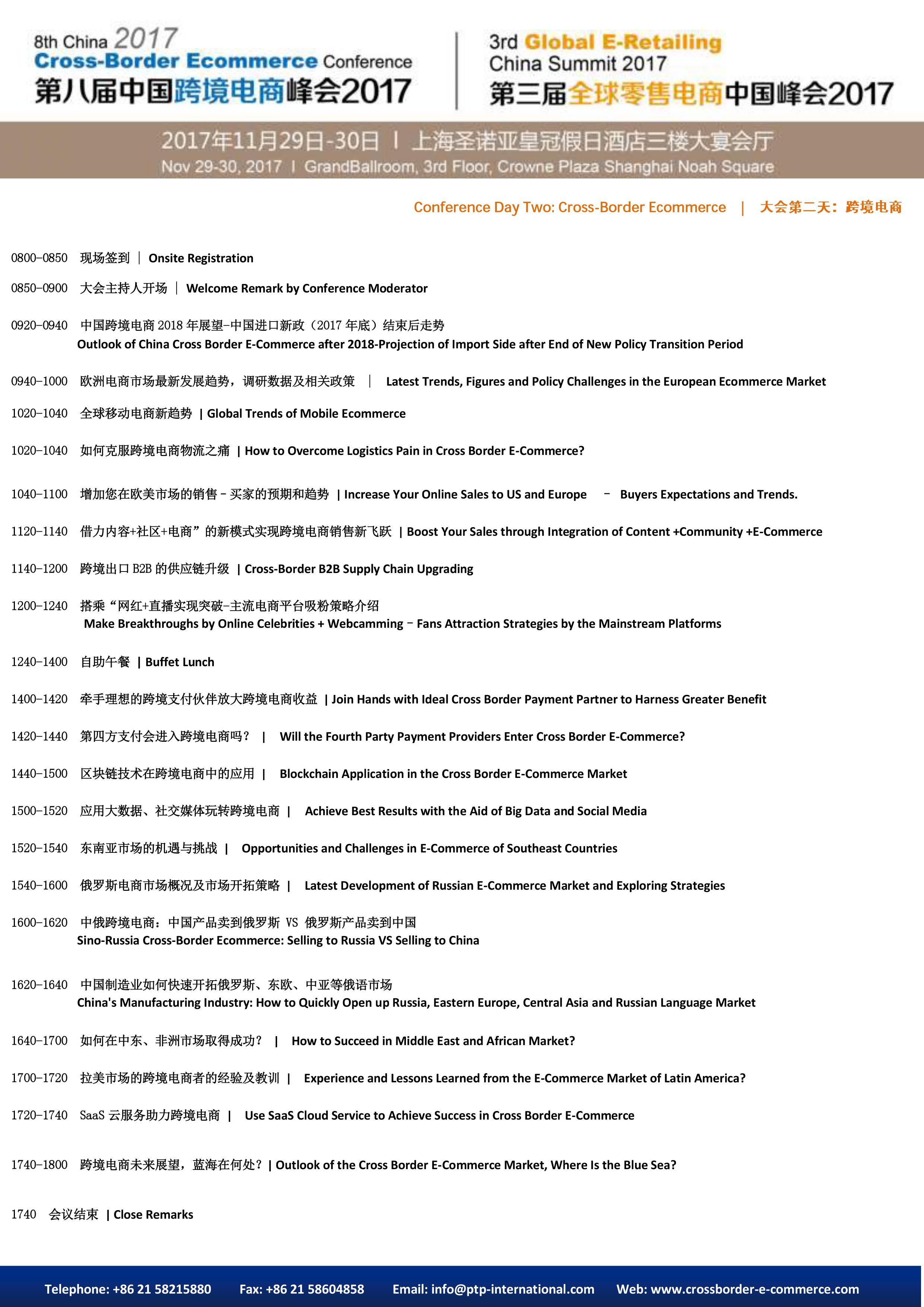 第八届中国跨境电商峰会暨展览2017将会再一次吸引超过500位来自20多个国家的高层代表出席,他们来自全球知名品牌商、零售电商、平台商户、B2B贸易公司、邮政物流公司、跨境支付公司、电子商务科技创新公司、风投公司等覆盖全产业链。本次峰会期间,我们将为展商和赞助商安排1对1项目洽谈,为跨境电商行业产业链各类领军企业一个展示品牌并进行业内合作及招商的机会,同期还有一个小型展览。通过此次活动,您可加深对中国跨境电商市场的了解,获取相关政策和国内外行业信息,在中国跨境电商进口市场的竞争中占得先机。