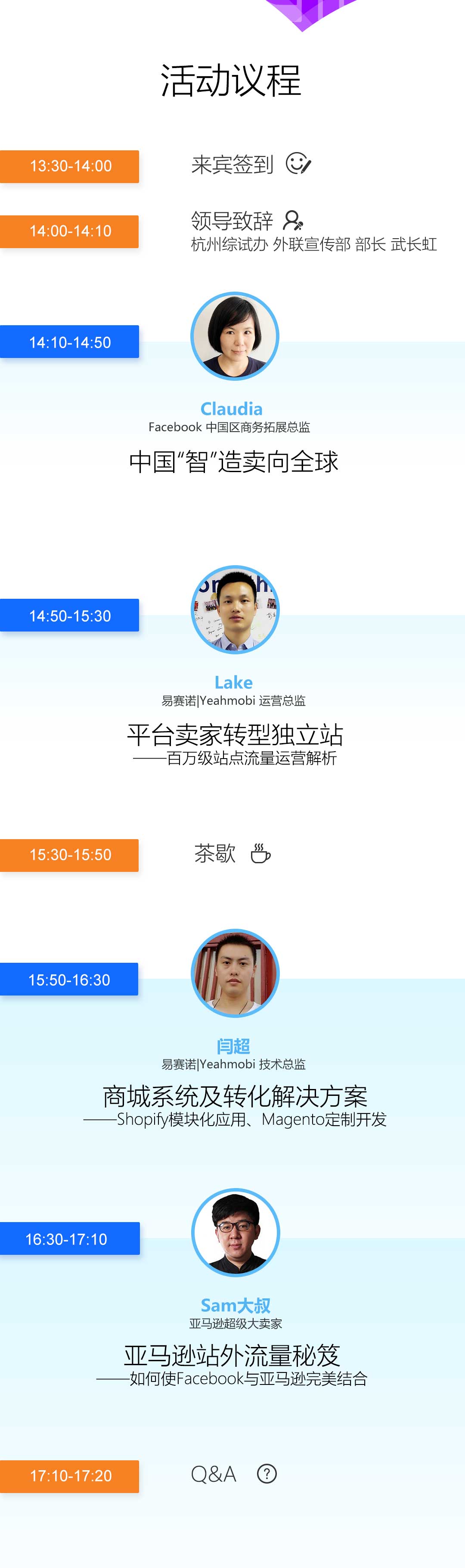 此次会议的嘉宾主要以跨境电商的品牌运营和引流为核心,以此从建站、运营和实际操作三个方向结合阐述,直击卖家的痛点,诚邀您的到来。